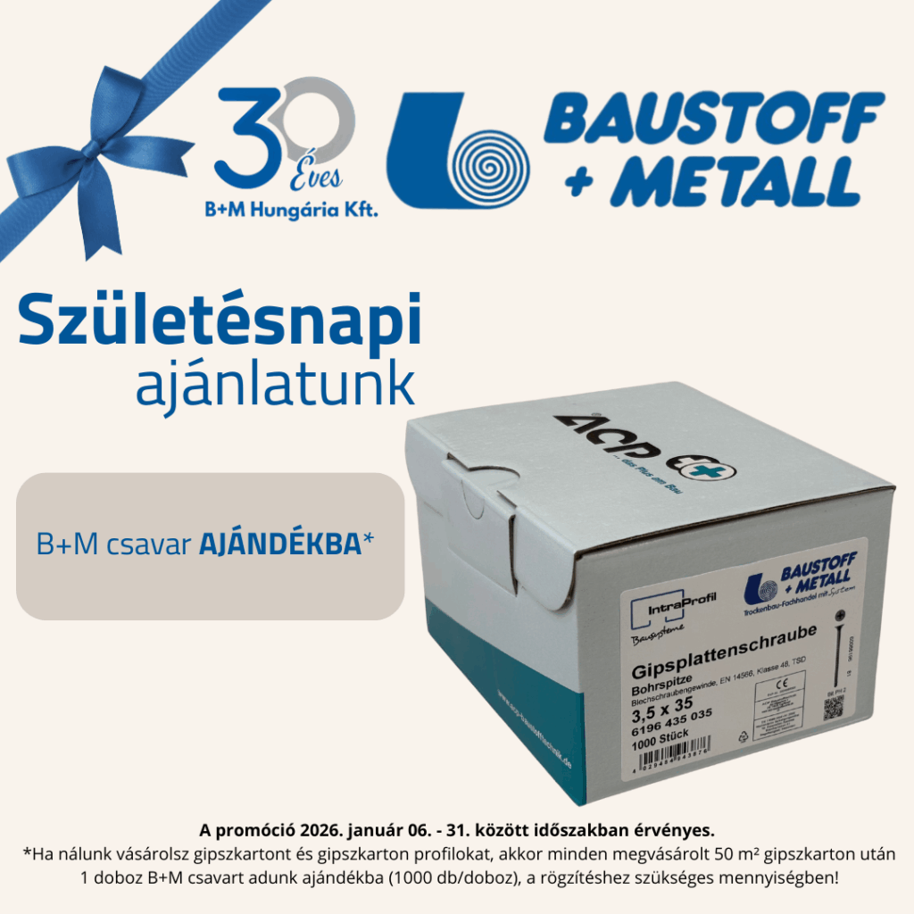Amennyiben telephelyeinken gipszkartont és gipszkarton profilokat vásárol, minden megvásárolt 50 m² gipszkarton után 1 doboz B+M csavart adunk ajándékba (1 doboz = 1000 db, a rögzítéshez szükséges mennyiségben).